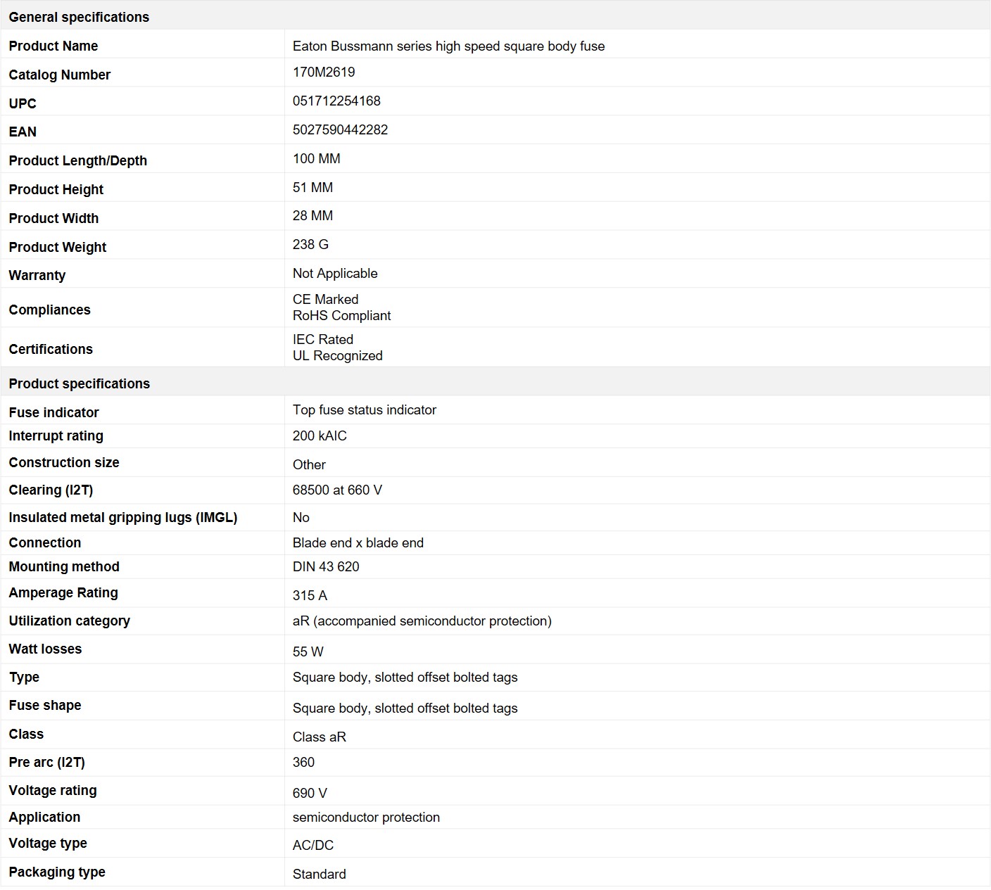 - Eaton Bussmann series high speed square body fuse, 700V (UL), 690V (IEC), 315A, 200 kAIC, Top fuse status indicator, Fuse, Blade end X blade end, Class aR, DIN 43 620 - 170M2619